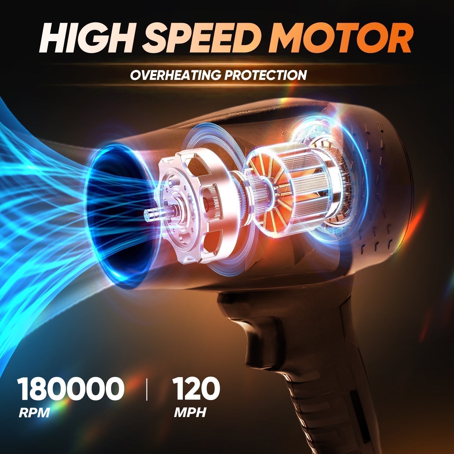 • Two-Speed Settings: Easily switch between two speed modes with a hard press for strong wind and a gentle press for low speed, offering versatility for different tasks.